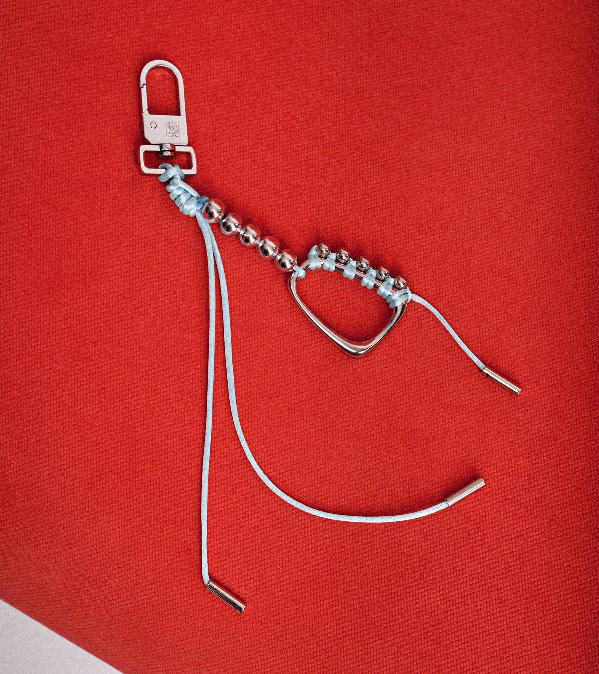 Nous avons aussi créé des grigris de sac à partir de mousquetons issus des stocks de la Maison, que nous avons re-tressés différemment. Ces charms sont des objets hybrides, qui habillent un sac, mais que l'on peut aussi accrocher à un jean, à un tote bag ou à son trousseau de clés.