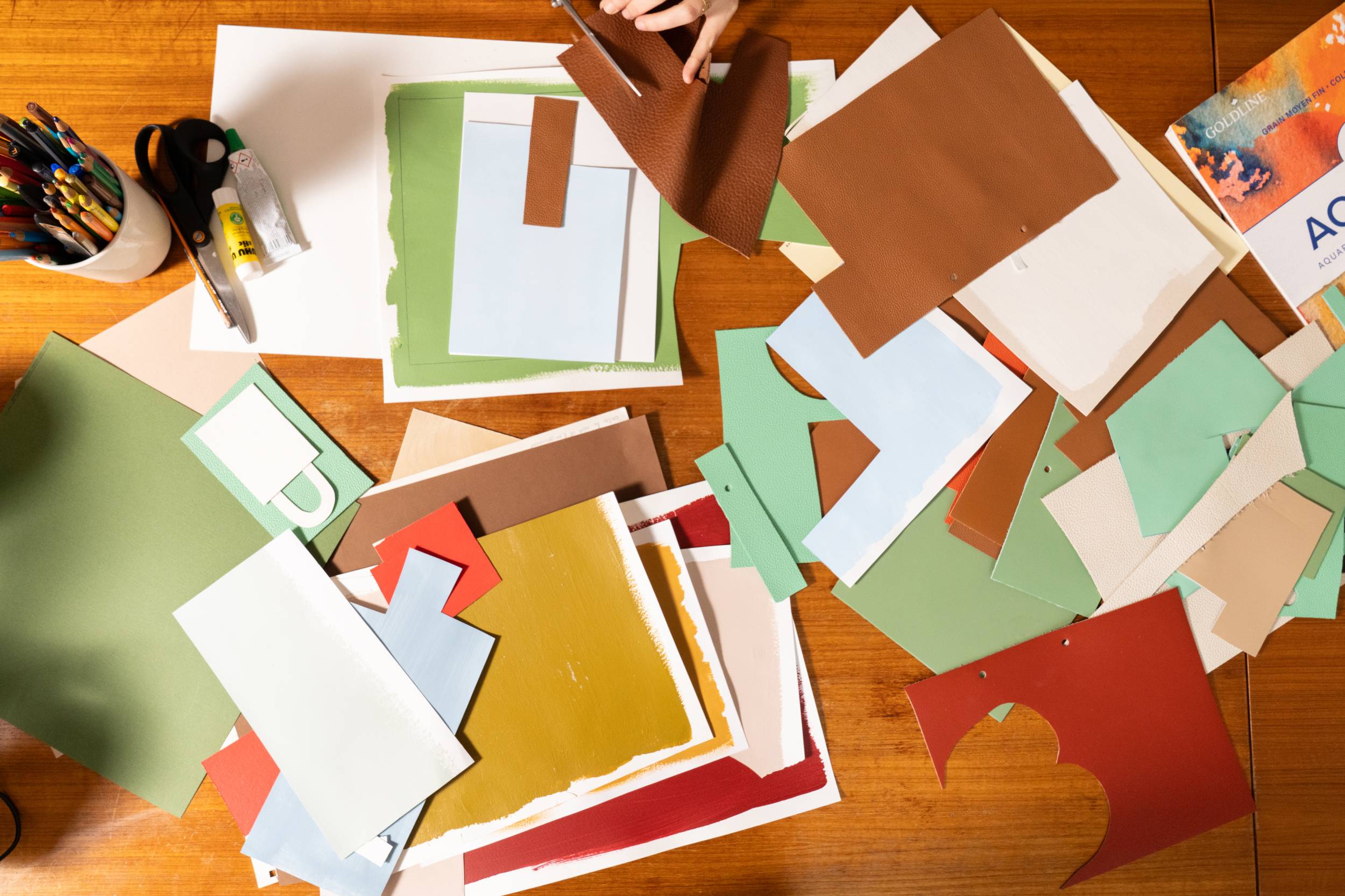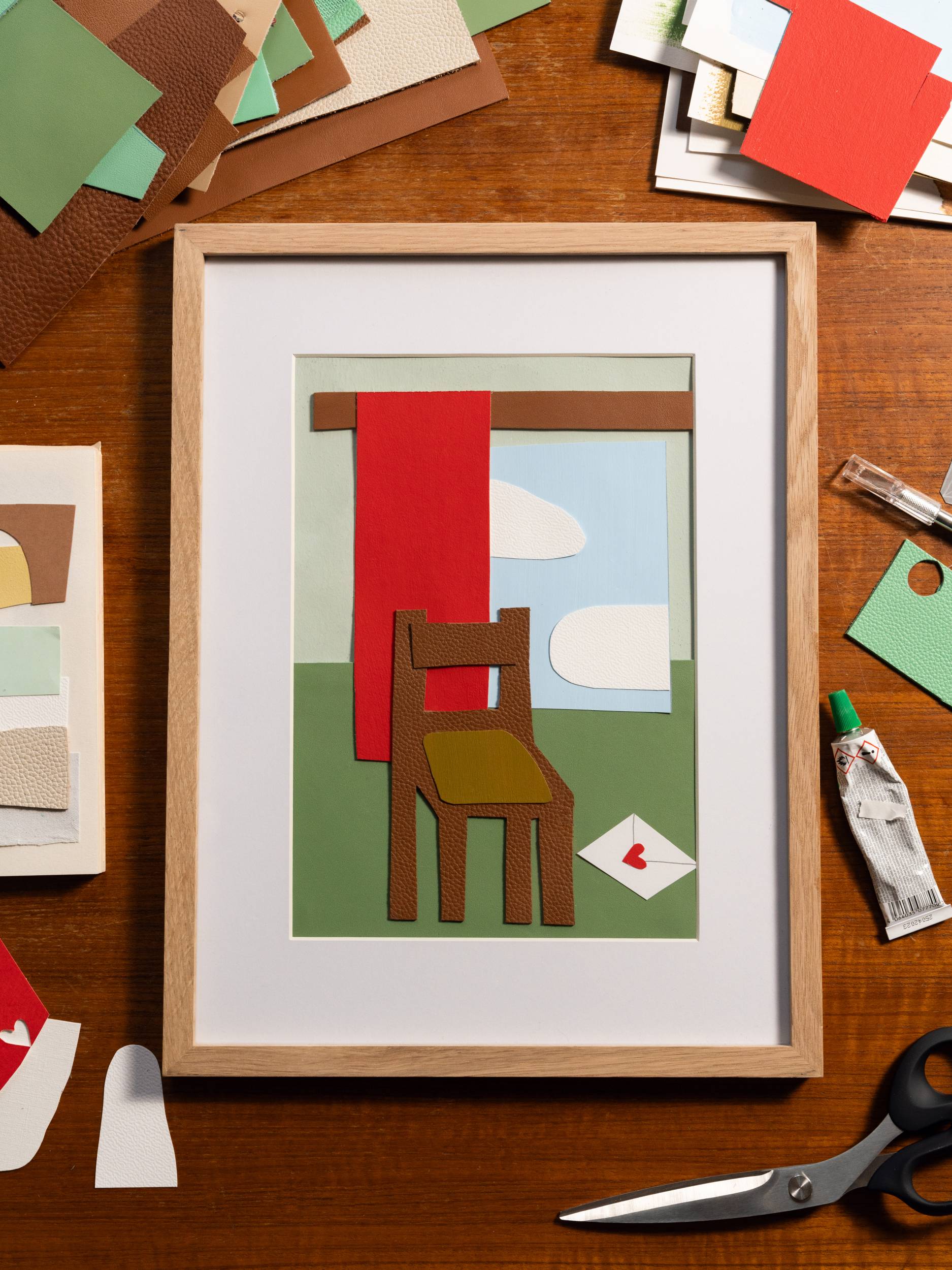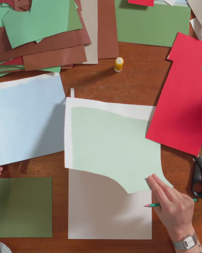 En matière de créativité, la vie quotidienne est un formidable point de départ. Là où nous fabriquons des pièces de maroquinerie, la plasticienne nantaise Amélie Dubois imagine plutôt de la poésie visuelle. À travers ses collages, la fondatrice de Maison Moche se plaît à transformer les “petits riens” du quotidien en images sensibles. Habitudes, objets, gestes et souvenirs deviennent l’essence même de son travail. Nous lui avons proposé de troquer, le temps d’un projet, son support de prédilection — le papier — pour des chutes de cuir colorées, afin de réaliser des œuvres destinées à nos vitrines. Dans son atelier, nous lui avons posé quelques questions sur cette collaboration et sur cette nouvelle façon de faire dialoguer le cuir avec le quotidien.
