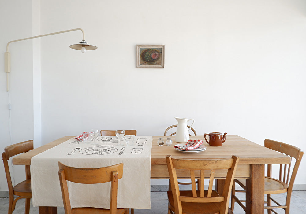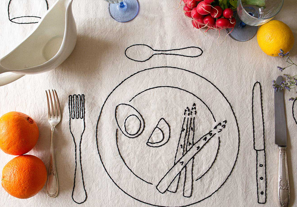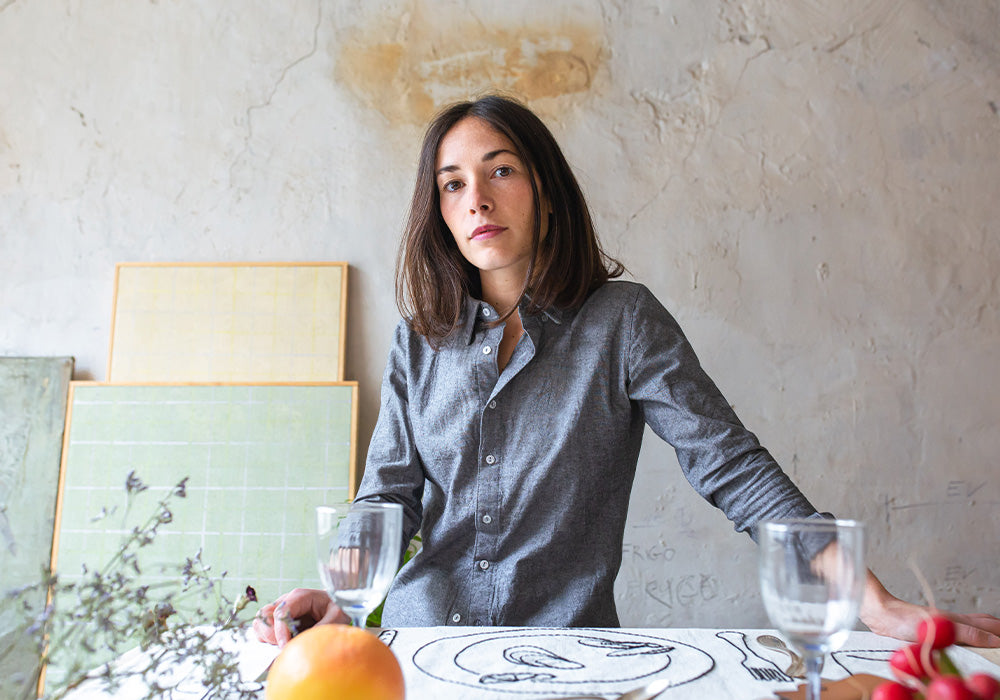 Sarah is an artist-designer with whom we collaborated to create embroidered tablecloths. She is one of those people we always enjoy meeting, whether under the shade of a Marseilles terrace or directly in her workshop, to discuss our shared passion for beautiful things.