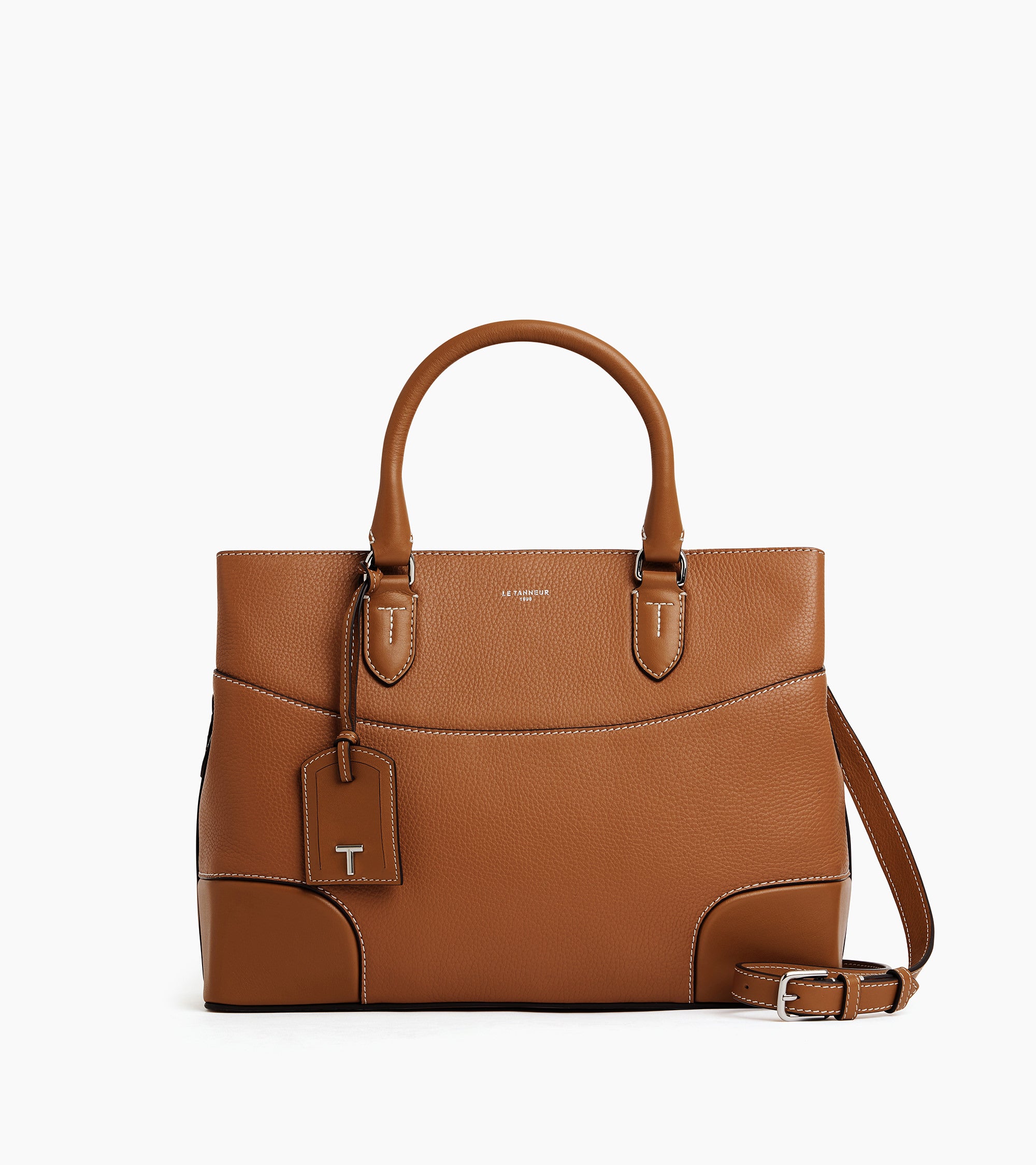 Carrying over a century of leather craftsmanship, the Romy line embodies the spirit of the numerous pieces imagined in our offices and workshops: modern, elegant, practical, and more enduring than ever. By combining grained leather with reinforcements that both round and strengthen the corners, the pieces in the Romy line perfectly reflect the ingenuity and care put into each one. Whether it's a leather handbag, a document holder, a backpack, or even a leather travel bag, we have expanded the Romy line to include a wide range of essential and timeless models, all with delightful surprises, starting with the Le Bleu lining, our signature color. Many small leather goods pieces are also offered, such as leather cardholders, flap wallets, and zip-around wallets. The Romy line is a testament to Le Tanneur's leather craftsmanship. The pieces in our Romy line are also distinguished by their distinctive and characterful jewelry, with a removable luggage tag charm for larger pieces or T jewelry with a silver finish for small leather goods. Finally, the hues – tan brown, black, or burgundy – are deliberately timeless. They complement everything, making these leather pieces key elements to wear every day and cherish for a lifetime.